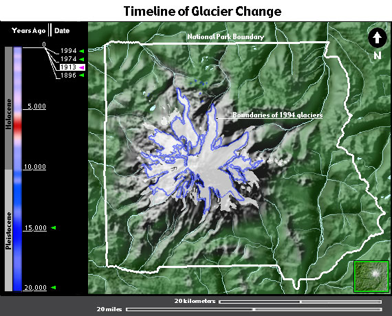 The lower division of the time line, the Pleistocene, actually extends from 1.6 million to 10,000 years. It is a period of time during which several global ice ages occurred. You can see how Mount Rainier and its surroundings might have looked during the late Pleistocene by clicking on 15,000 or 20,000 years ago. The upper division, the Holocene, is period of a global warming, during which time the world's glaciers have retreated and sea level has risen. To see how Mount Rainier's glaciers changed during the late Holocene, click on 1896, 1913,1974, or 1994. The red and blue bar next to the Holocene and Pleistocene bars show average global temperature during the past 20,000 years. The dark and medium blue bands show periods of global cooling. The red and pink bands show periods of global warming. Dark blue is coldest and bright red is warmest(c).