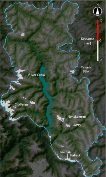 The Little Ice Age was a period of glacier growth that extended from the late 1500's to about the 1850's. (c) This was a period of lower temperature on a global scale that brought about the advance of glaciers by an average of several kilometers at high latitudes and altitudes. Since glacier research in the Pacific Northwest did not begin until the late 1800's there is little direct information about the size of the glaciers in the Upper Skagit Basin during the Little Ice Age. Much of what we know is derived from mapping old glacial moraines and other post-glacial features. Because much of this work is in progress little is known about the extent of little ice age glaciers in the Skagit River Basin beyond the Silver Creek and Ross Lake Areas. (c) The glacier extents shown in this map are based on unpublished preliminary maps drawn by Austin Post, Wendell Tangborn, F. Rosenblatt, and Don Richardson of the U.S. Geological Survey.
