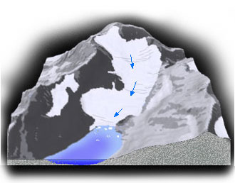 - Figure 2 - Cross section of a typical alpine glacier showing the two major zones of a glacier and ice flow within the glacier. The blue arrows show the direction and speed of the moving ice. The longer the arrow, the faster that ice is moving.