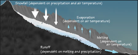 Figure 6 - A simplified diagram of glacier mass budget, showing major mass input (snowfall) and outputs (melting, and runoff).