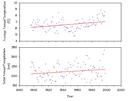 Figure 7 - Graph of annual average temperature and average total precipitation for 1897 to 1998. Based on data for the Cascade West Climate Division. The red lines show the general trend of both temperature and precipitation, while the blue dots show the annual variation of both values. (c)